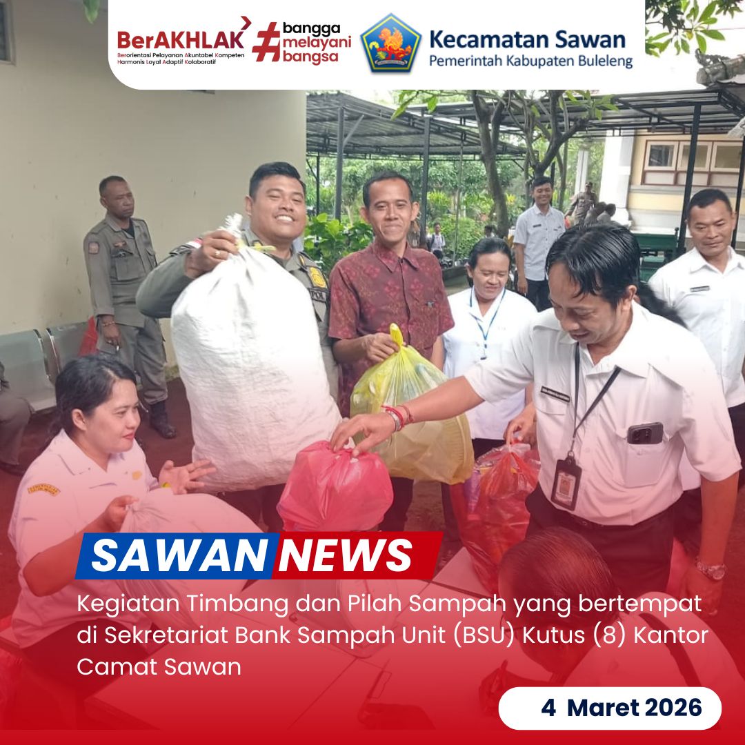 Hari ini rabu, 4 maret 2026 Seluruh pegawai Kantor Camat Sawan melaksanakan kegiatan timbang dan pilah sampah di Sekretariat Bank Sampah Unit (BSU) Kutus (8). Kegiatan ini merupakan bentuk komitmen bersama dalam mendukung pengelolaan sampah berbasis sumber di lingkungan perkantoran.