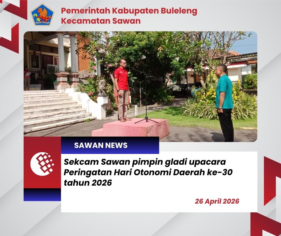 Hari ini Minggu 26 April 2026 Sekretaris Kecamatan (Sekcam) Sawan, Gde Agus Ngurah Suryawan, S.Sos memimpin langsung pelaksanaan gladi upacara dalam rangka persiapan peringatan Hari Otonomi Daerah ke-30 Tahun 2026. Kegiatan tersebut dilaksanakan di halaman Kantor Camat Sawan.